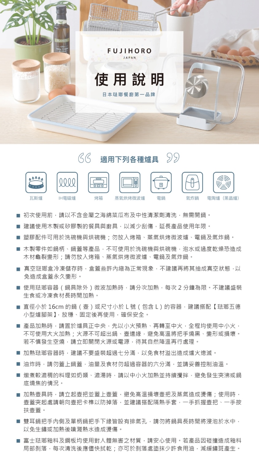 【富士琺瑯】花田方形有耳琺瑯方便鍋(1.5L)+玻璃蓋+炸籃+隔熱手套